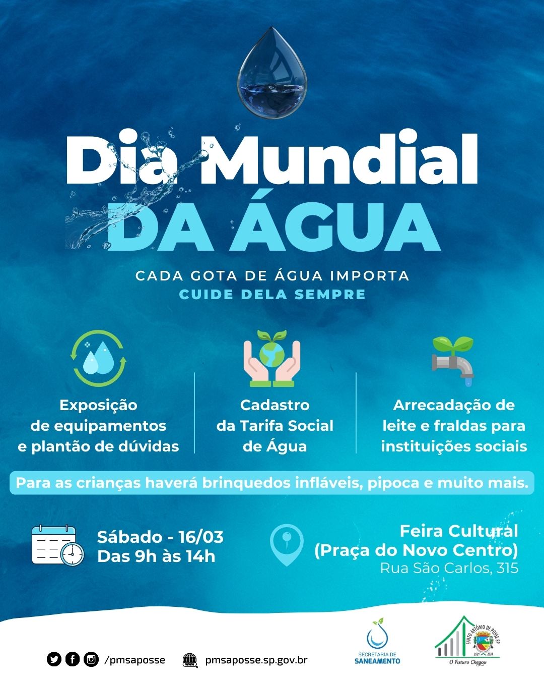 Em celebração ao Dia Mundial da Água, a Prefeitura Municipal, por meio da Secretaria de Saneamento, promove no sábado, 16 de março, uma ação ambiental na Feira Cultural, localizada na Praça do Novo Centro, próxima à Caixa Econômica Federal. A iniciativa acontecerá das 9h às 14h e tem por objetivo ressaltar a importância de cuidar dos nossos recursos hídricos e naturais para garantir o futuro das próximas gerações.