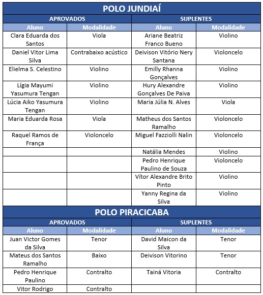 Aprovados nos polos das cidades de Jundiaí e Piracicaba, com foco nas modalidades de Orquestra Sinfônica e Coro, respectivamente, os alunos receberão uma bolsa de estudo e terão um amplo repertório de ensino durante 12 meses, com acompanhamento sociopedagógico qualificado, workshops, masterclasses, apresentações com artistas renomados e produção de concertos.