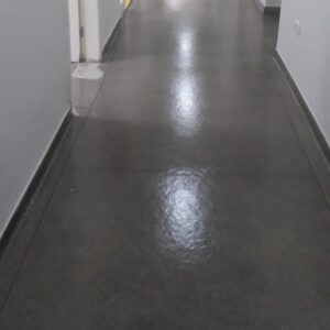 Primeiro foi removido as sujeiras do piso, após a remoção, a preparação com lavagem geral e neutralização dos produtos utilizados, e por fim, o tratamento com selador, impermeabilizante e antiderrapante.