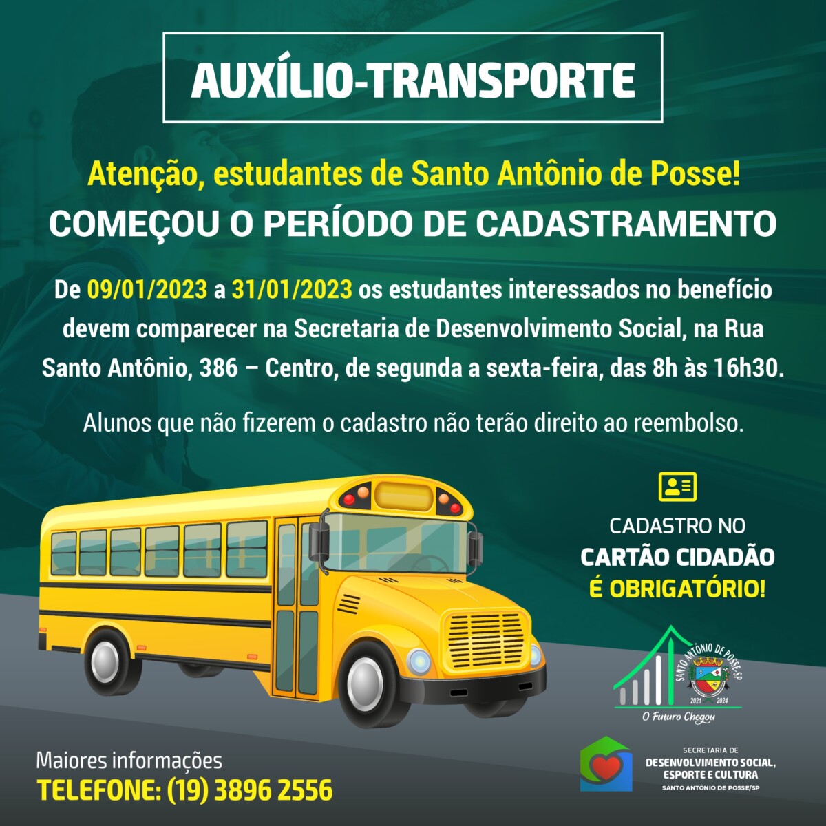 Começou o período de cadastramento do Auxílio-Transporte de Santo Antônio de Posse. Os estudantes interessados no benefício devem comparecer na Secretaria de Desenvolvimento Social, na Rua Santo Antônio, 386 – Centro, de segunda a sexta-feira, das 8h às 16h30.