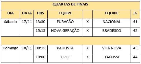 Após esses jogos, estabeleceu-se quais times jogarão as quartas de finais que acontecerão no sábado dia, 17 e no domingo, dia 18. Acompanhe na tabela os horários dos jogos.