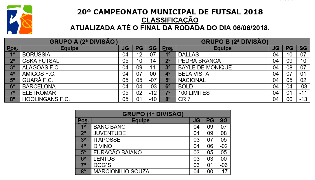 Abaixo, a Classificação Geral do Campeonato Municipal de Futsal.