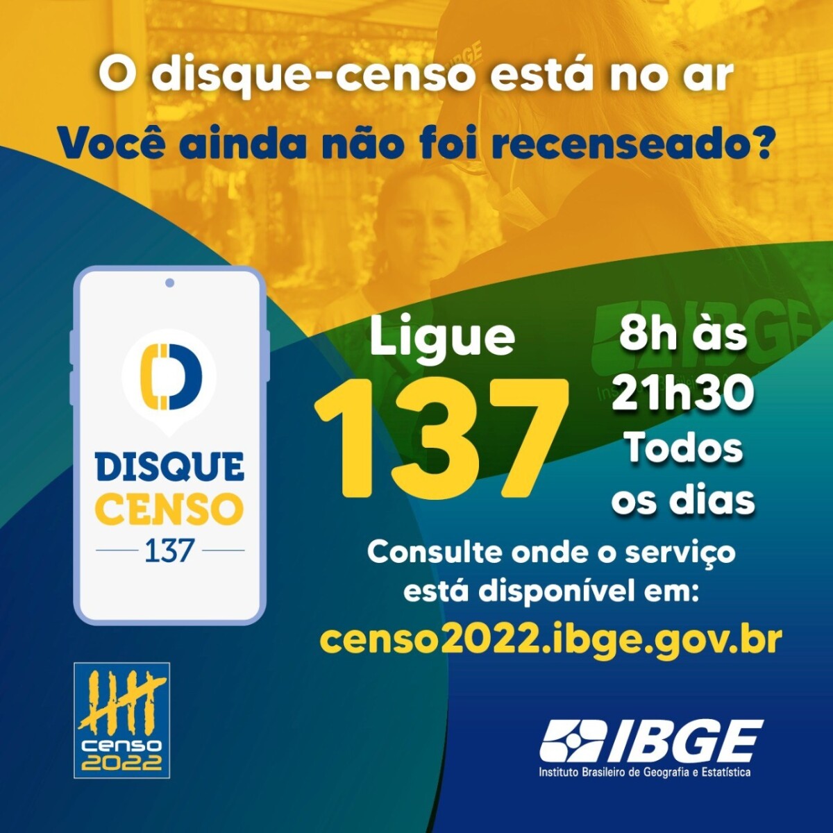Consulte neste link mais informações sobre o Disque Censo: https://censo2022.ibge.gov.br/pecas-de-divulgacao/disque-censo.html