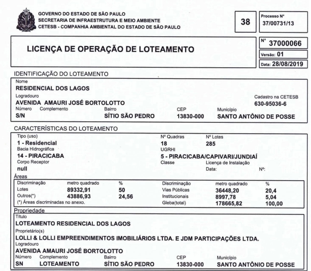 CETESB libera Licença de Operação do Loteamento Residencial dos Lagos