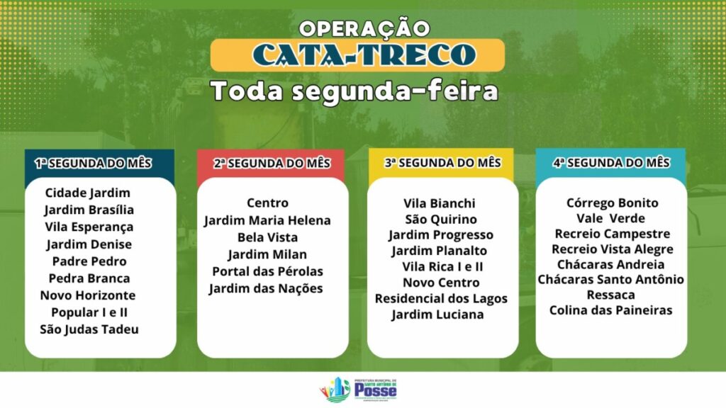 O Cata-TRECO é uma ação que tem como objetivo impedir que materiais inservíveis e lixo vegetal sejam depositados em vias públicas, córregos e terrenos baldios. Para que a operação aconteça de forma correta, é preciso se atentar as seguintes instruções: