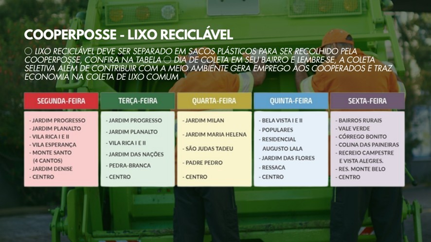 O lixo reciclável deve ser separado em sacos plásticos para se recolhido pela CooperPosse. Confira na tabela o dia de coleta em seu bairro e lembre-se, a coleta seletiva além de contribuir com o meio ambiente, gera emprego aos cooperados e traz economia na coleta de lixo comum.