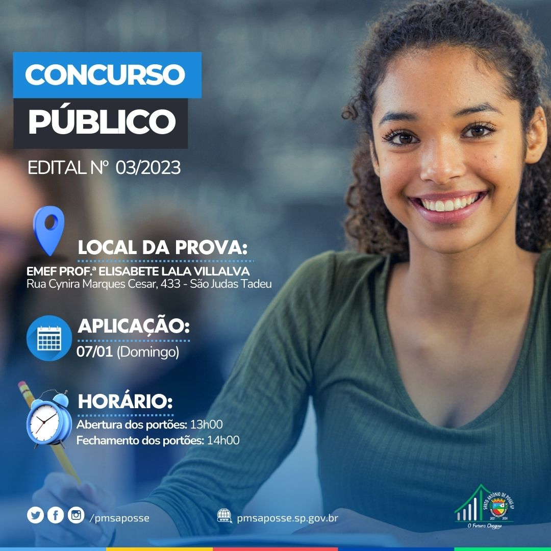 Acontece neste domingo, 7 de janeiro, as provas objetivas do Concurso Público Nº 003/2023, destinado ao preenchimento de 11 vagas em 5 cargos da administração pública. A prova acontecerá na EMEF Profª. Elisabete Lala Villalva “CIEF”, localizada na Rua Cynira Marques Cesar, 433 – São Judas Tadeu. Os portões abrem às 13h e fecham às 14h.