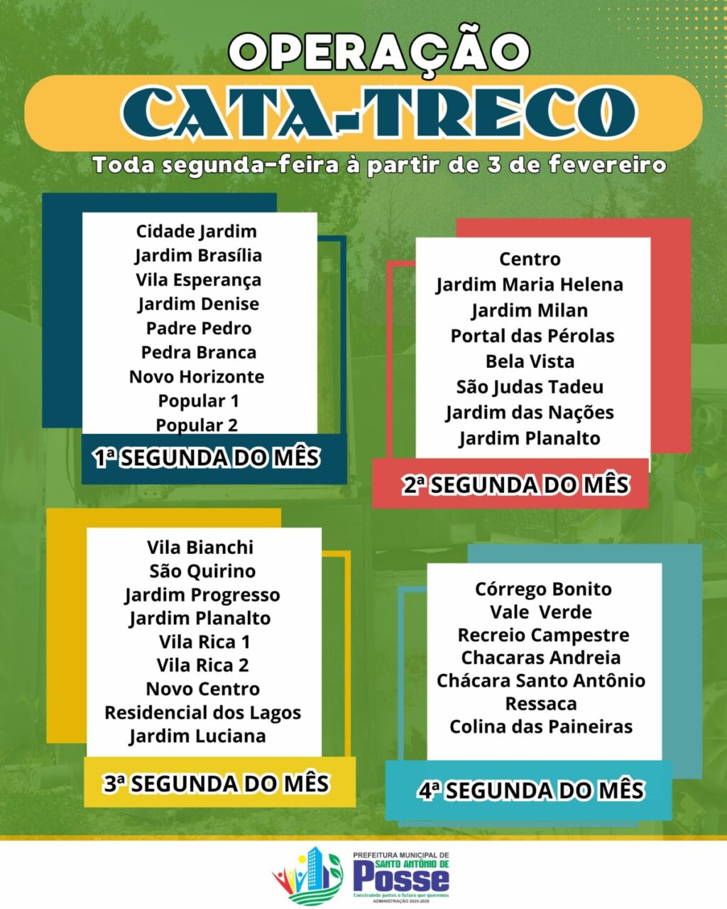 Confira os horários da Operação Cata-Treco Iniciativa começa no dia 3 de fevereiro 27 de janeiro de 2025 Compartilhe Facebook Twitter LinkedIn WhatsApp E-mail Você também pode gostar Capacitação Com presença do governador do Estado, formandos de Santo Antônio de Posse participam de cerimônia da Carreta de Capacitação neste sábado 27 de junho de 2025 Neste sábado, 29 de junho, 39 alunos de Santo Antônio de Posse participam da cerimônia de formatura dos cursos de Panificação e Açougue, ... avanços na saúde PSF do Residencial dos Lagos passa a oferecer atendimento odontológico 11 de agosto de 2025 O PSF José Masotti “Kué”, no bairro Residencial dos Lagos, passou a contar a partir desta segunda-feira, 11 de agosto, com uma ... Férias em Ação Férias em Ação leva cultura, diversão e aprendizado às famílias possenses durante o mês de julho 3 de julho de 2025 Pensando em transformar o recesso escolar em um momento de lazer, cultura e aprendizado, o projeto “Férias em Ação” vai movimentar ... 21º Campeonato Figueirense conquista o título do Campeonato Municipal de Futebol Amador 2025 28 de julho de 2025 A equipe do Figueirense é a grande campeã da 21ª edição do Campeonato Municipal de Futebol Amador de Santo Antônio de Posse. A final foi ... segurança e bem-estar Prefeitura inicia iluminação na Estrada dos Martins e trecho do Matadouro 26 de agosto de 2025 A Prefeitura iniciou nesta semana a instalação de iluminação na Estrada dos Martins, no trecho que liga o querido Monte Santo — como é ... construção de uma nova unidade de saúde Prefeitura e Câmara Municipal unem forças para a construção de uma nova unidade de saúde no bairro Padre Pedro 27 de junho de 2025 Em ação conjunta, a Prefeitura de Santo Antônio de Posse e a Câmara Municipal anunciaram nesta sexta-feira, 27, o investimento de R$ 1 ...
