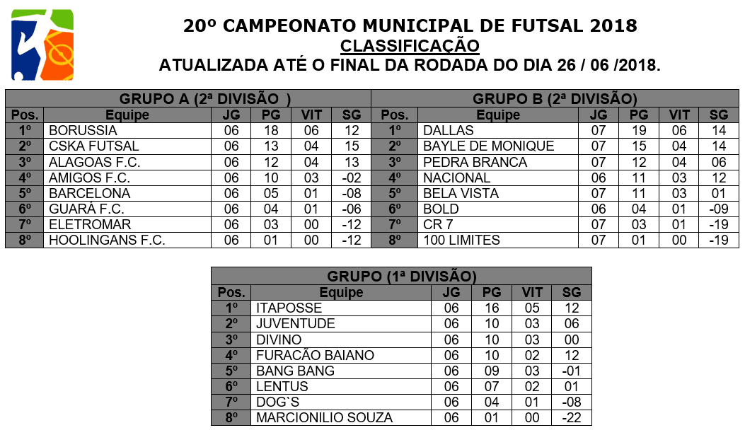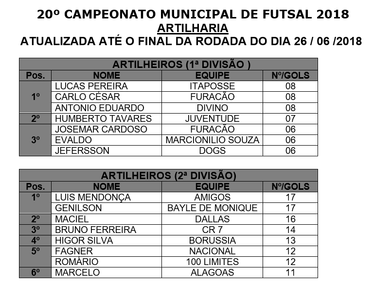 De quarta-feira, dia 20 de junho, até o fechamento desta edição do Jornal Oficial, o Campeonato Municipal de Futsal teve três dias de jogos e nove partidas. Na quinta-feira, dia 21 de junho, o time Amigos F.C. ganhou a partida contra o Hooligans F.C com placar de 8 a 6, já o Barcelona e o Eletromar empataram o jogo em 2 a 2 e, para finalizar, o Marcionilio Souza marcou 2 gols em partida contra a equipe do Dog’s que acabou ganhando a partida com 7 gols marcados.