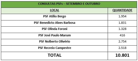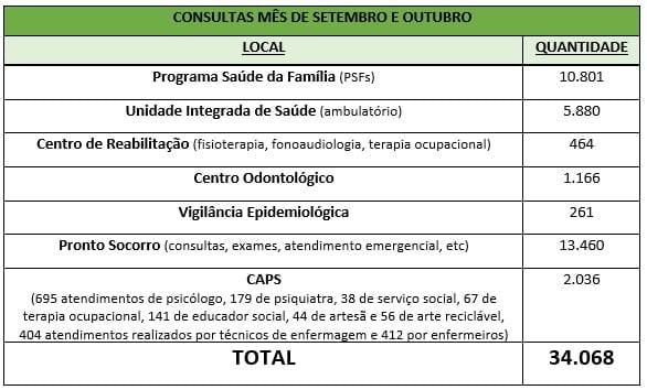 A Secretaria de Saúde de Santo Antônio de Posse liberou o levantamento dos atendimentos realizados no município durante os meses de setembro e outubro. Reforçamos que os números abaixo disponibilizados são referentes a todos os procedimentos da área de saúde realizados, como exames, suturas, aplicação de doses de vacina, recolhimento de material, além dos atendimentos e consultas realizadas nos PSFs, Unidade Integrada de Saúde (ambulatório), Centro de Reabilitação (fisioterapia, fonoaudiologia, terapia ocupacional), Centro Odontológico, Vigilância Epidemiológica, consultas no Pronto Socorro e CAPS.