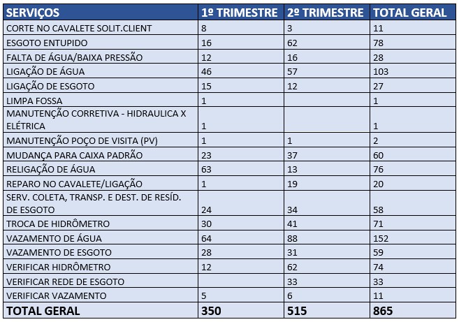 A Diretoria de Água e Esgoto de Santo Antônio de Posse finalizou o primeiro semestre de 2020 com números que demonstram compromisso e trabalho sério. Mesmo diante da pandemia, o DAE executou 515 atendimentos no segundo trimestre, 47% a mais em relação aos serviços executados no primeiro semestre. Ao todo, nos seis primeiros meses foram realizados 865 serviços, uma média de 4,8% atendimentos diários.