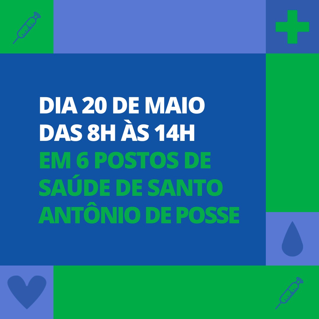 Com intuito de aumentar a cobertura vacinal da população, a Prefeitura de Santo Antônio de Posse, por meio da Secretaria Municipal de Saúde, promove neste sábado, 20 de maio, o Dia D de Vacinação contra a Covid-19 e a Influenza, o vírus da gripe. A campanha acontecerá das 8h às 14h, em todos os Postos de Saúde da Família (PSFs).