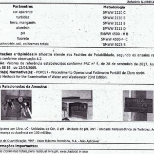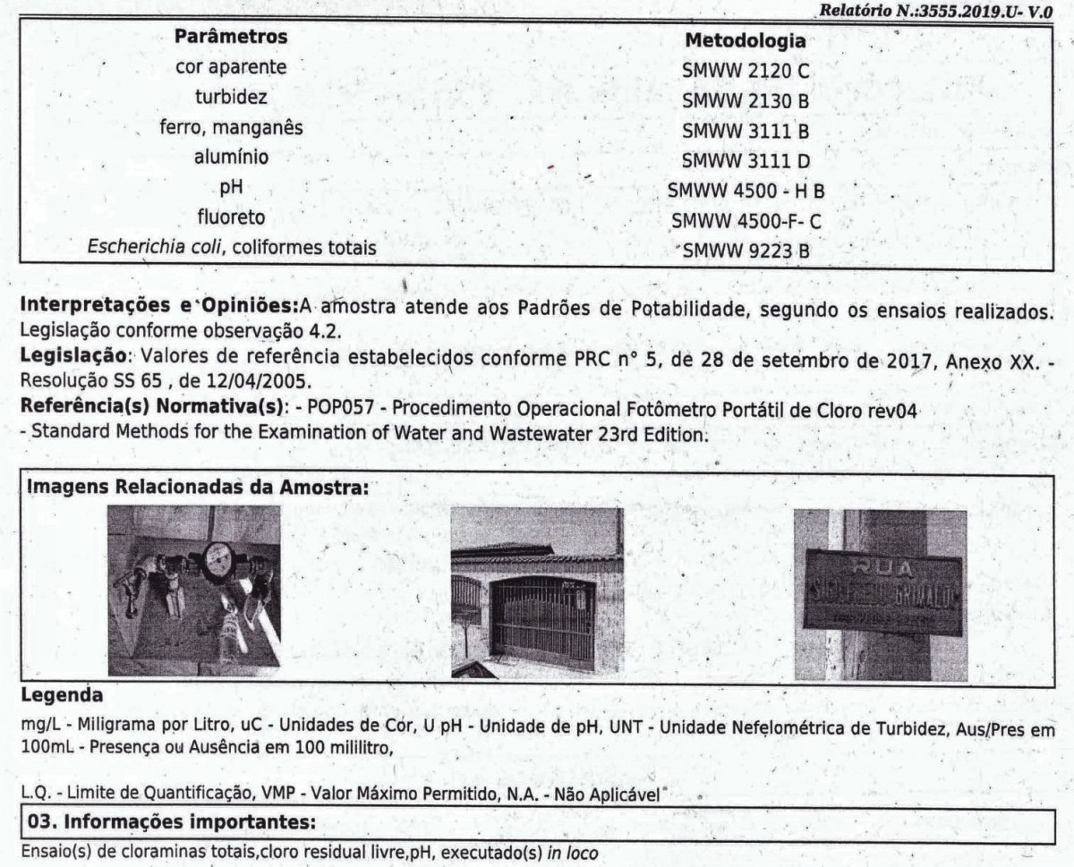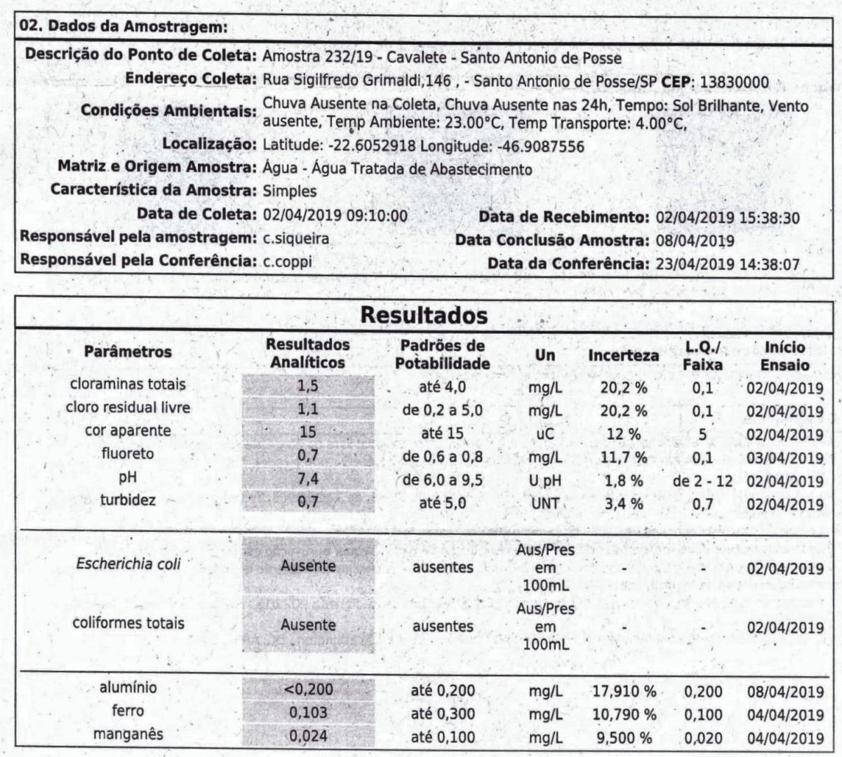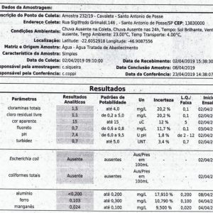 Em última coleta, realizada na data de dois de abril de 2019, através do Relatório de Ensaio nº 3555.2019, comprovou-se a qualidade da água tratada em Santo Antônio de Posse, conforme imagens abaixo: