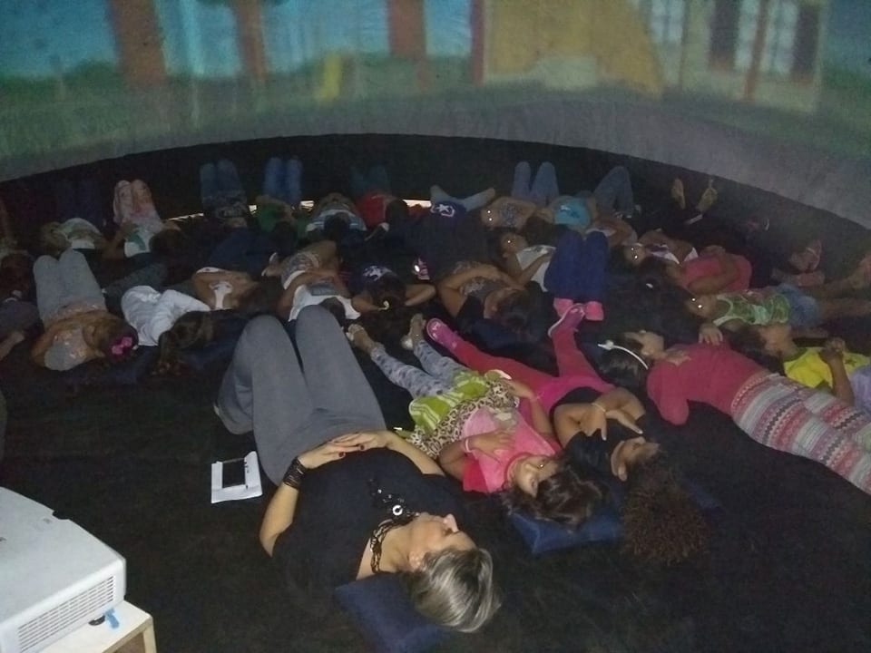 Dentro do planetário, as crianças e adolescentes têm contato com conteúdo educativos como aulas sobre astronomia, mudanças climáticas e preservação ambiental.