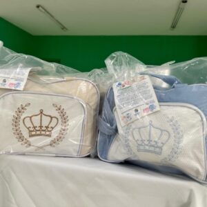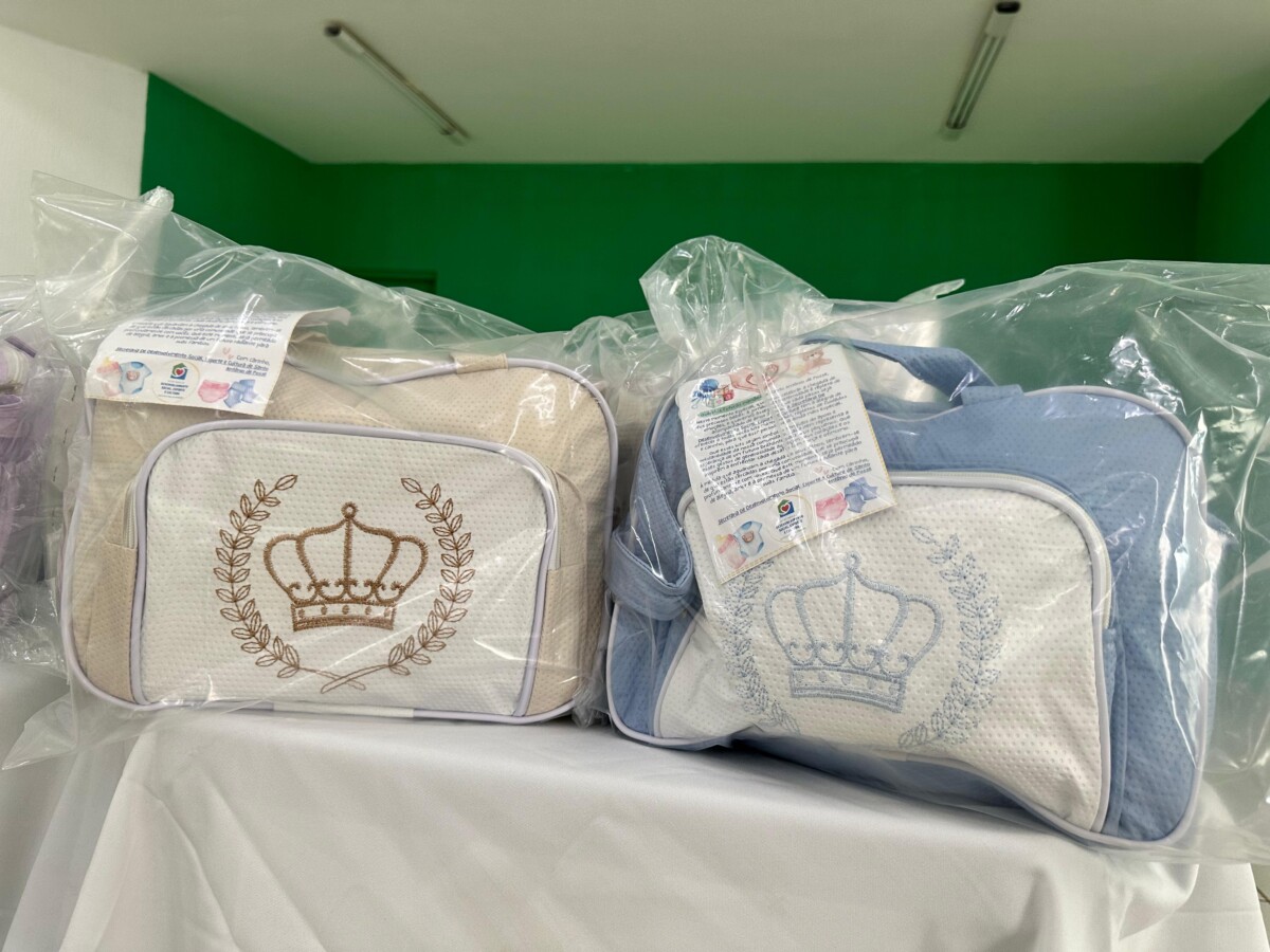 Cada kit contém itens essenciais para os primeiros meses do bebê, tais como roupinhas para o recém-nascido, toalhinha de banho e fraldas