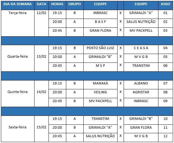 Os jogos acontecerão no Ginásio Municipal de Esportes Francisco Ferreira e Silva, que fica na Rua Euclides Constantino s/nº, bairro Vila Rica II, com início sempre às 19h15.