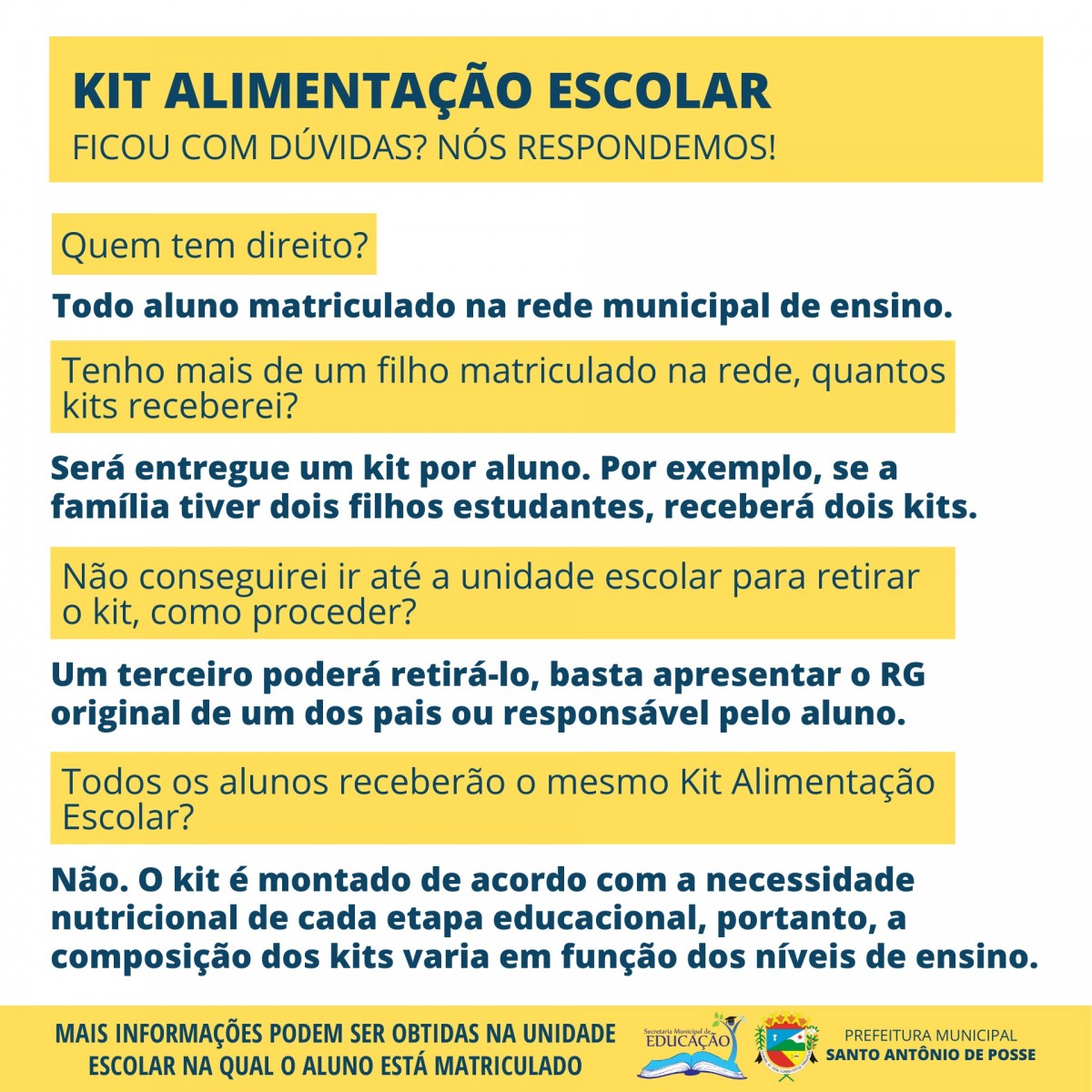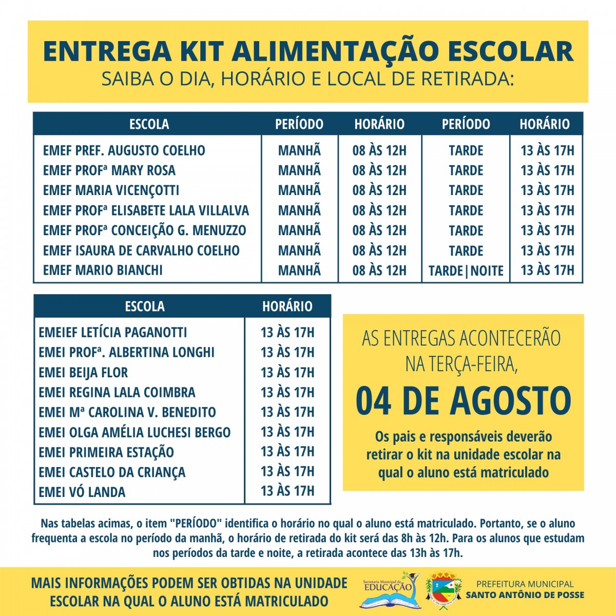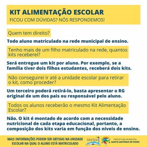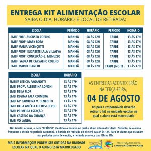 A Prefeitura Municipal de Santo Antônio de Posse, por meio da Secretaria de Educação, realizará a distribuição do Kit Alimentação Escolar na terça-feira, dia 4 de agosto. Esta será a terceira entrega dos kits aos alunos matriculados no Ensino Infantil e Fundamental I e II da rede municipal de ensino.