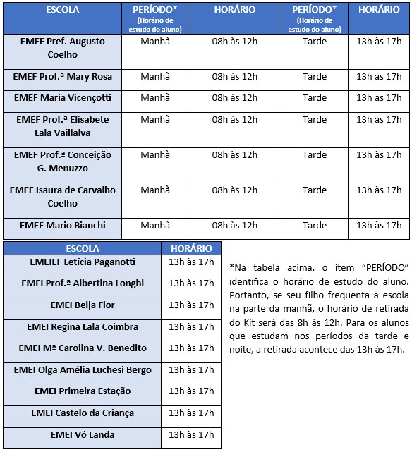 Confira a tabela de distribuição dos kits: