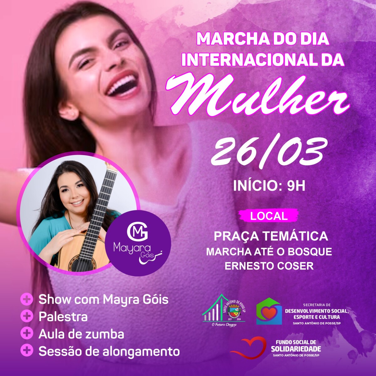 E temos mais novidades. O evento ainda contará com show da artista Mayra Góis, palestra, aula de zumba e sessão de alongamento. Não fique de fora, participe!
