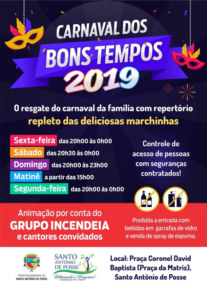 O Carnaval está chegando e a Prefeitura Municipal e a Diretoria de Cultura e Turismo já prepararam tudo para animar os dias de festa dos possenses. O “Carnaval dos Bons Tempos” será realizado na sexta, sábado, domingo e segunda-feira, com uma matinê programada para tarde de domingo.