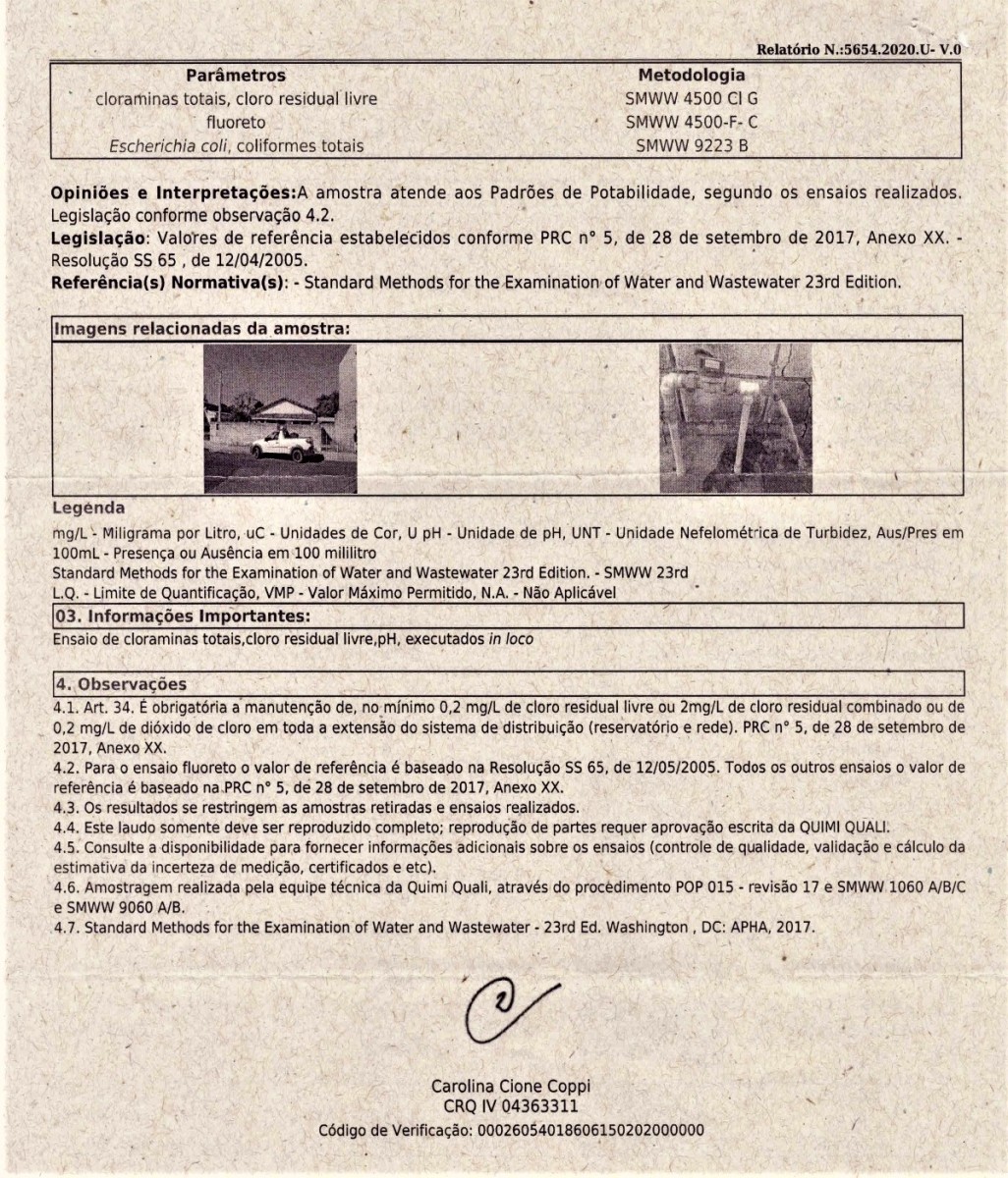 Em Santo Antônio de Posse, a coleta foi realizada em 8 de maio, numa residência localizada na rua Ernesto Chiarini de Ugo, no bairro Vila Esperança. O trabalho gerou o Relatório de Ensaio nº 6564.2020 que certificou a qualidade da água tratada e distribuída no município, o que garante que não há nenhum parâmetro em desconformidade com a legislação vigente.