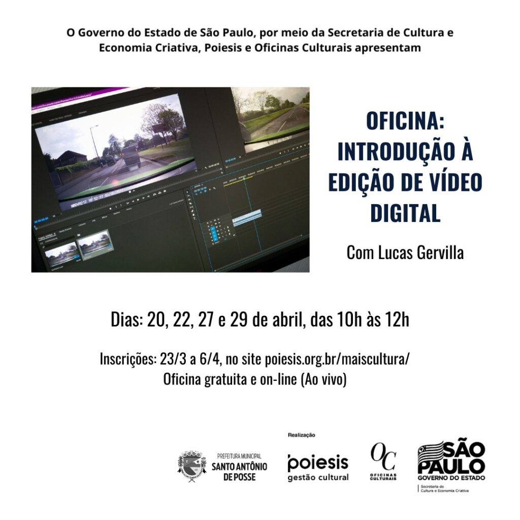 A Oficina será totalmente gratuita e as inscrições deverão ser realizadas de 23 de março a 06 de abril através do Link : https://poiesis.org.br/maiscultura/oficinas_culturais/introducao-a-edicao-de-video-digital/