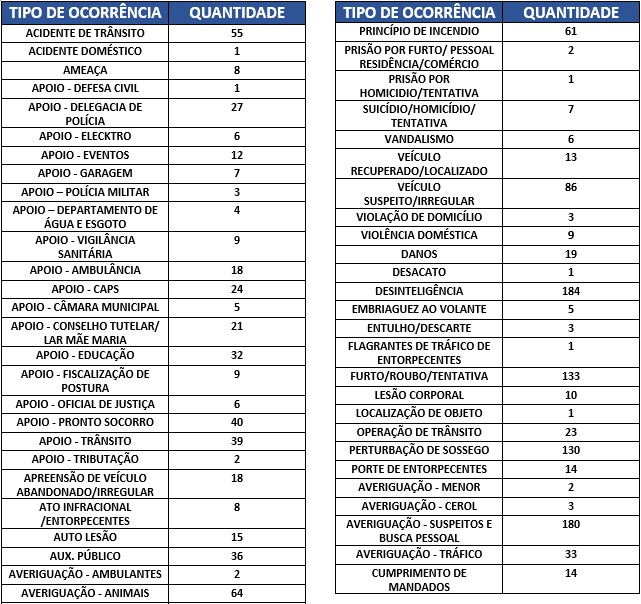 O órgão efetuou de janeiro a dezembro um total de 184 atendimentos de desinteligência, 180 averiguações de suspeitos e busca pessoal, 133 operações contra furto, roubo e tentativa e 130 registros de perturbação de sossego. Estas foram as atividades com números mais expressivos.