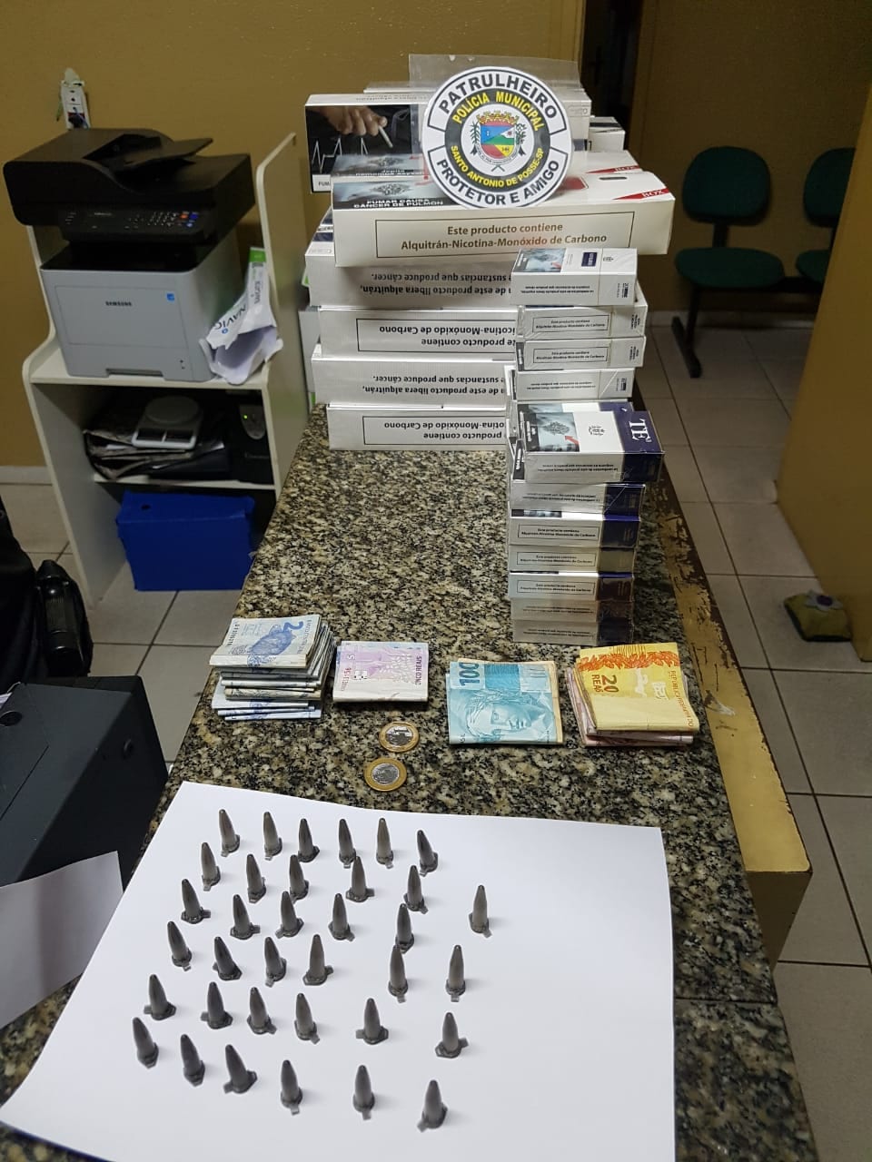 Ao averiguar uma denúncia anônima de tráfico de drogas em um comércio na Vila Esperança no domingo, dia 14 de outubro, agentes da Polícia Municipal fizeram a apreensão de 35 pinos de cocaína, R$957,00 em dinheiro e 390 maços de cigarros provindos do Paraguai.