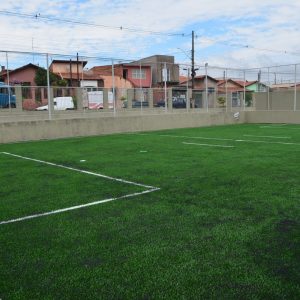 Além disso, realizou-se a instalação de um campo Society na quadra externa, com revestimento em grama sintética, alambrado para fechamento da quadra e construção de arquibancada. Uma calçada que dá acesso a pista de skate e a quadra Society também foi construída.