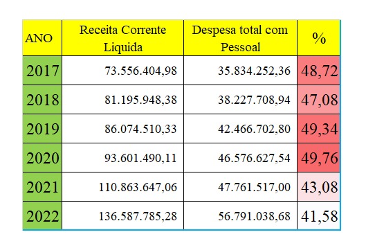 Em 2020, os gastos com quadro de funcionários chegaram a 49,76%, da Receita Corrente Liquida, de R$ 93.601.490,11. No ano seguinte, em 2021, houve uma diminuição das despesas dessa natureza, reduzida para 43,08%. Já em 2022, uma nova queda foi registrada com a folha salarial de profissionais, para 41,58%, em comparação com a arrecadação, isso porque, o orçamento municipal aumentou, chegando à marca de R$ 136.587.785,28.