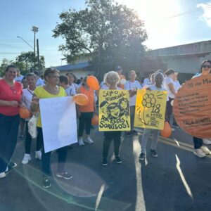 Durante o percurso, os participantes expuseram faixas de conscientização e distribuíram panfletos com informações sobre indicadores de violência e orientações acerca de como denunciar casos dessa natureza.