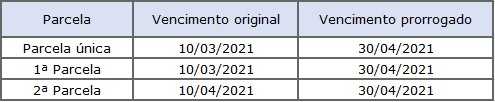 As parcelas do Imposto Predial Territorial Urbano do exercício de 2021 (IPTU-2021) passam a ter as seguintes datas de vencimento: