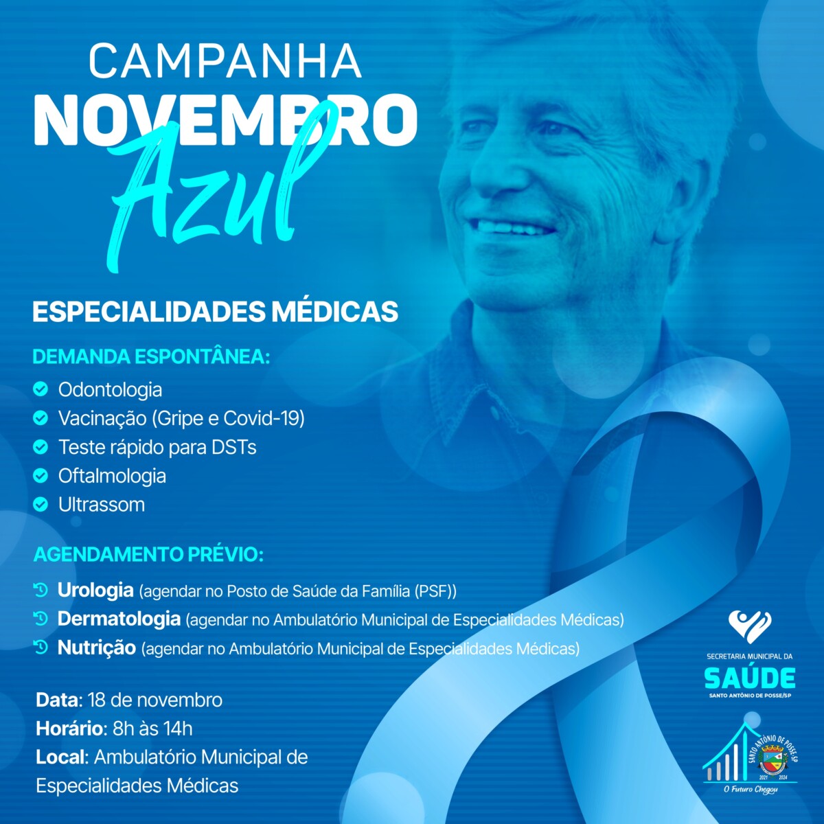 A Prefeitura de Santo Antônio de Posse, por meio da Secretaria Municipal da Saúde, promove no sábado, 18 de novembro, no Ambulatório Municipal de Especialidades Médicas, a campanha Novembro Azul, com ações de prevenção ao câncer de próstata. A iniciativa irá acontecer das 8h às 14h, com atendimentos nas áreas de urologia, dermatologia, nutrição, mediante agendamento prévio, e odontologia, vacinação, teste rápido para DSTs, oftalmologia e ultrassonografia, por demanda espontânea.