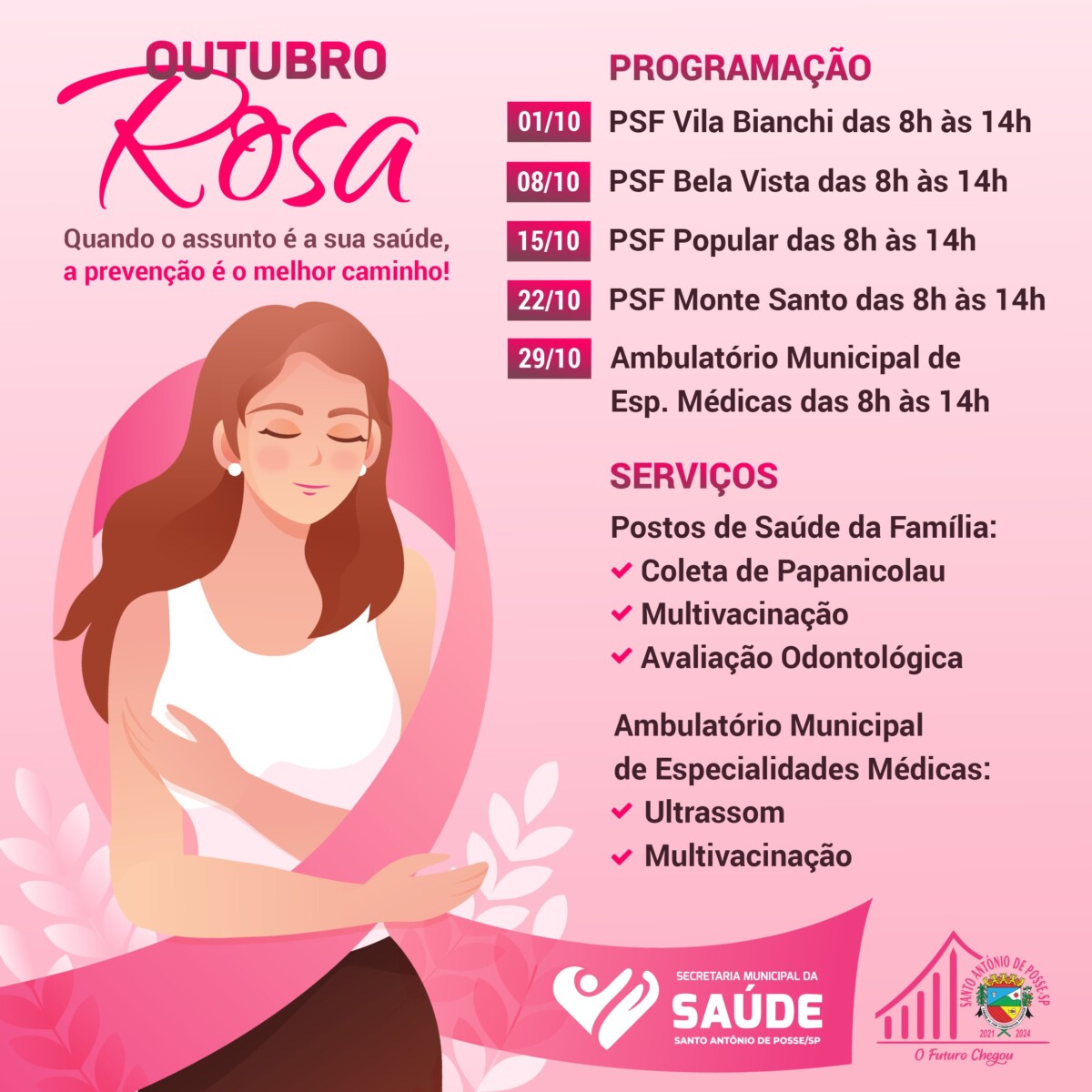 A Prefeitura Municipal, por meio da Secretaria da Saúde, realiza ao longo do mês de outubro, uma série de ações voltadas a saúde da mulher, em decorrência do “Outubro Rosa”. A iniciativa busca anualmente compartilhar informações e conscientização sobre o controle do câncer de mama, proporcionando maior acesso aos serviços de diagnóstico e de tratamento e contribuir para a redução da mortalidade.
