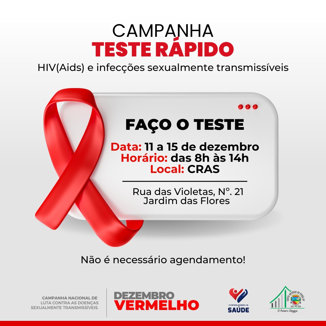 Neste mês de dezembro, dedicado a luta contra o vírus HIV, a Aids e outras IST (infecções sexualmente transmissíveis), a Prefeitura Municipal, por meio da Secretaria da Saúde, promove entre os dias 11 e 15 de dezembro, a campanha de teste rápido para detecção precoce de HIV/Aids. A iniciativa acontecerá das 8h às 14h, no Centro de Referência de Assistência Social (CRAS), localizado na Rua das Violetas, 21 – Jardim das Flores. Não há necessidade de agendamento prévio, basta procurar a unidade nos dias e horários informados.