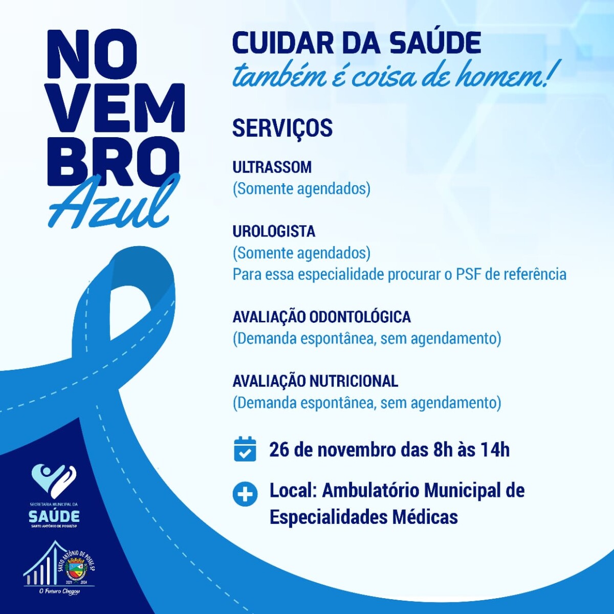 A Prefeitura Municipal, por meio da Secretaria da Saúde, promove neste sábado, 26, a campanha Novembro Azul, com foco na prevenção e conscientização do câncer de próstata. A ação acontece das 8h às 14h, no Ambulatório Municipal de Especialidades Médicas, e contará com atendimento com médico urologista, realização de ultrassom mediante agendamento, além de avaliação odontológica e nutricional por demanda espontânea e vacinação contra COVID-19.