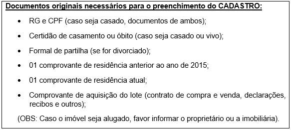 Solicitamos aos moradores, a gentileza de receber os cadastradores, utilizando máscara, e com os documentos originais já separados, para que possam fazer as fotos digitais, de forma rápida e segura. NÃO será necessário fazer cópias impressas, apenas separar os documentos originais.