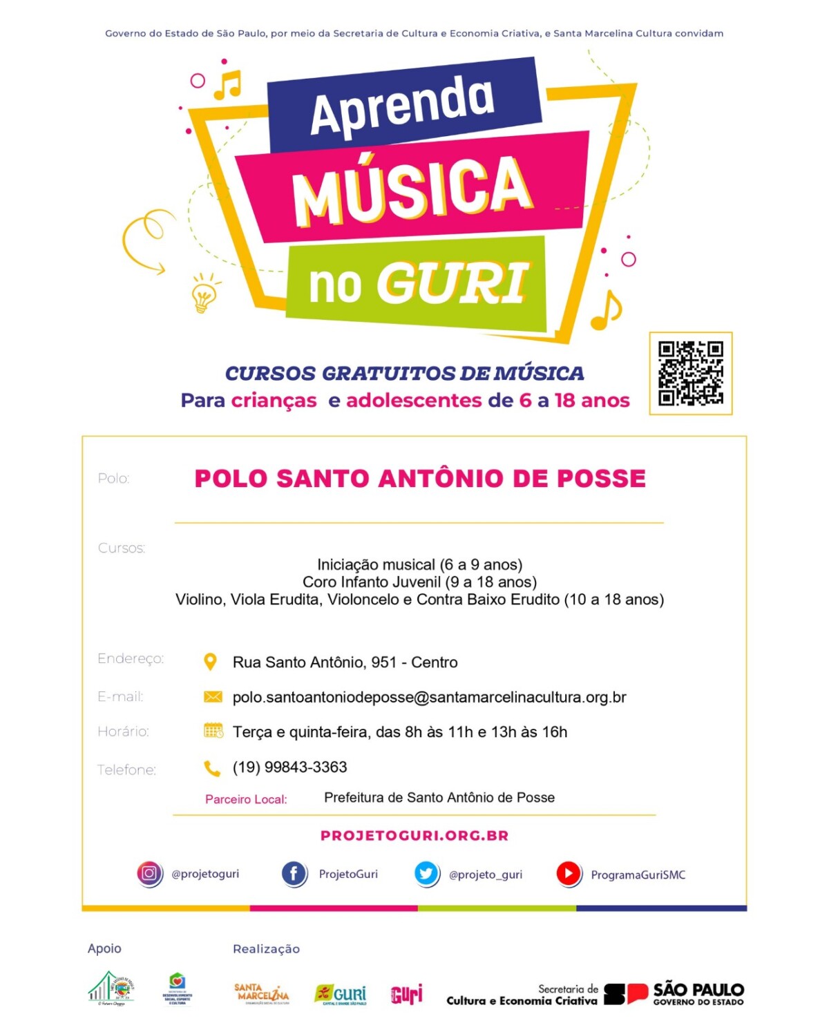 O Projeto Guri está com inscrições abertas para aulas de musicalização gratuita. As vagas são limitadas e a idade para participar do projeto é de 6 a 18 anos. As inscrições devem ser realizadas no polo de Santo Antônio de Posse, localizado na Rua Santo Antônio, 951, às segundas, terças e quintas-feiras, das 9h às 16h. Para participar não é preciso ter conhecimento em música, nem ter instrumento musical.