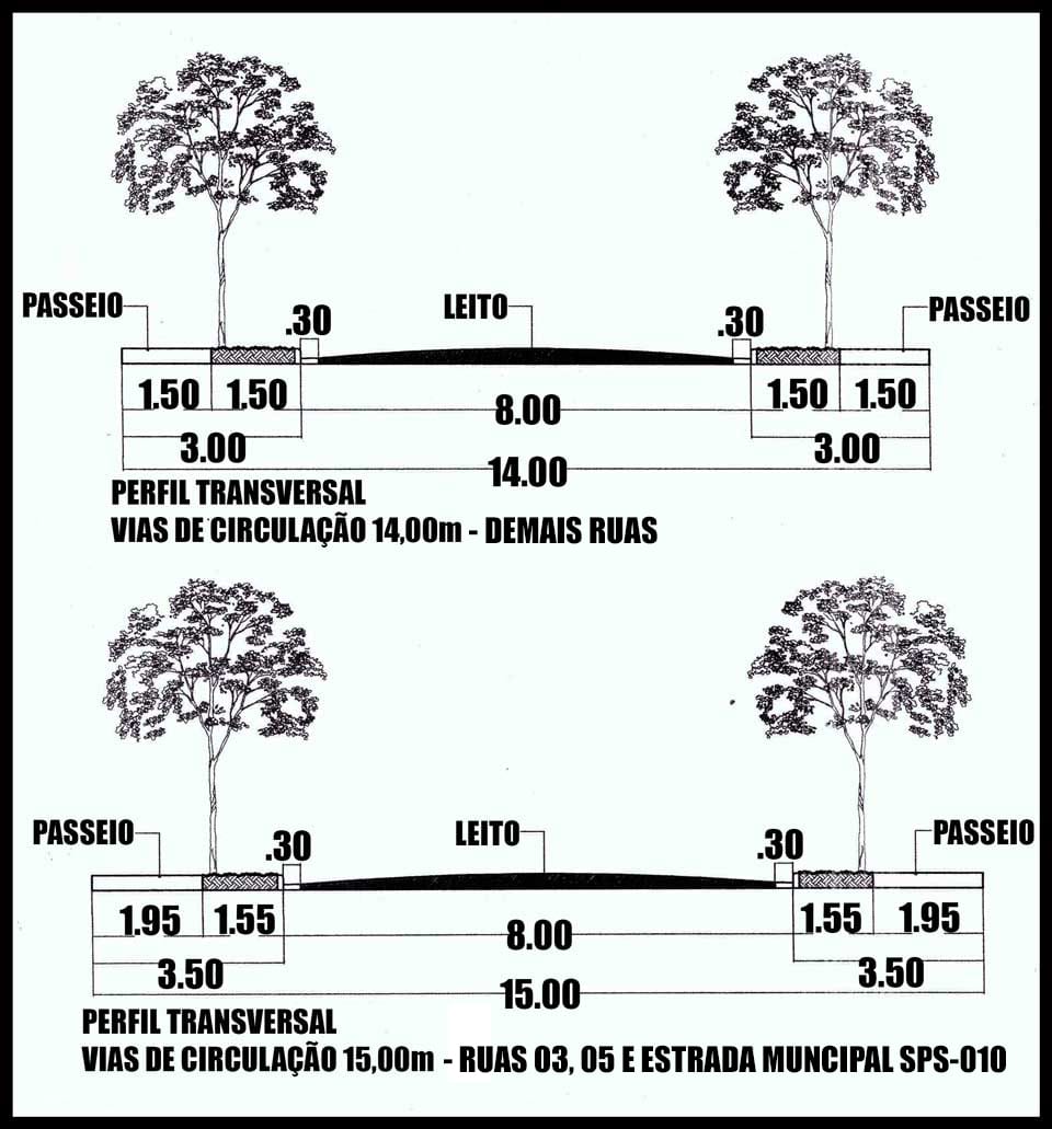 O projeto aprovado nesta Prefeitura e CETESB, estabelecia as ruas do loteamento com largura total de 14,00 metros, com exceção das ruas Orivaldo Ponfírio da Silva (rua projetada 03) e Gilmar Cardoso dos Santos (rua projetada 05), além da Estrada Municipal SPS-010, que possuem a largura de 15,00. Conforme imagem abaixo:
