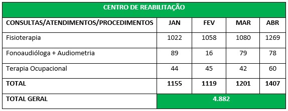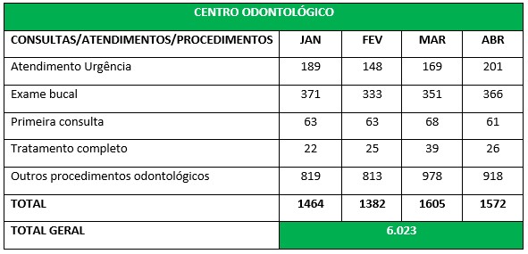 A Secretaria de Saúde também liberou os números de atendimentos do Centro Odontológico e Centro de Reabilitação. Assim como os demais, o valor corresponde ao primeiro quadrimestre de 2019. Confira: