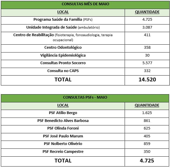 A Prefeitura Municipal de Santo Antônio de Posse, através da Secretaria de Saúde, divulga o levantamento mensal, referente a maio, de consultas e procedimentos realizados nas unidades de saúde de Santo Antônio de Posse. Ao todo, foram 14.520 atendimentos. A relação leva em conta todos os serviços de saúde realizados nos PSFs, Unidade Integrada de Saúde (ambulatório), Centro de Reabilitação (fisioterapia, fonoaudiologia, terapia ocupacional), Centro Odontológico, Vigilância Epidemiológica, consultas no Pronto Socorro e consultas realizadas no CAPS.