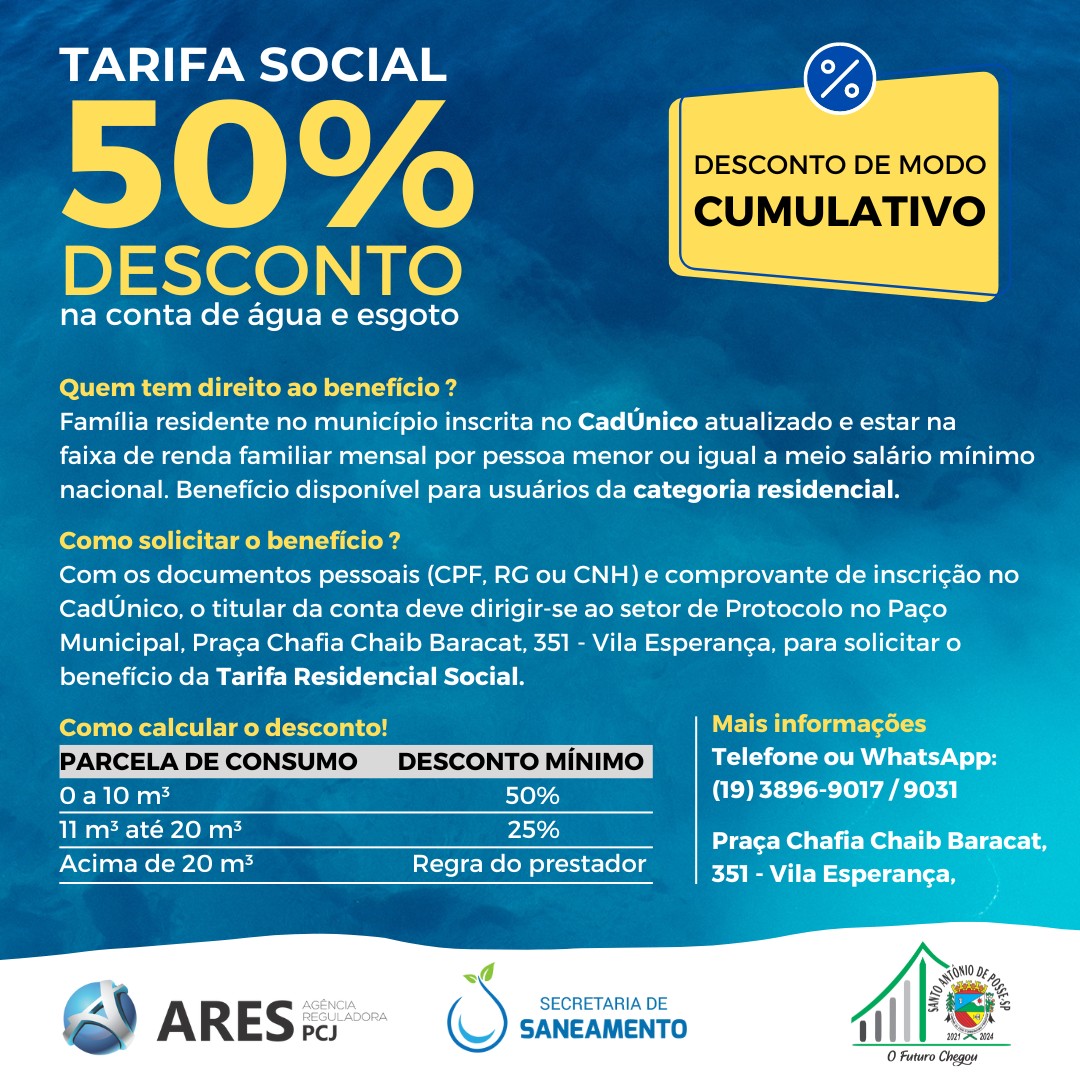 Você sabia que famílias residentes no município inscritas no CadÚnico atualizado com faixa de renda familiar mensal por pessoa menor ou igual a meio salário mínimo nacional, tem direito a Tarifa Social de Água e Esgoto? O programa concede 50% de desconto na conta de água e esgoto, de modo cumulativo.
