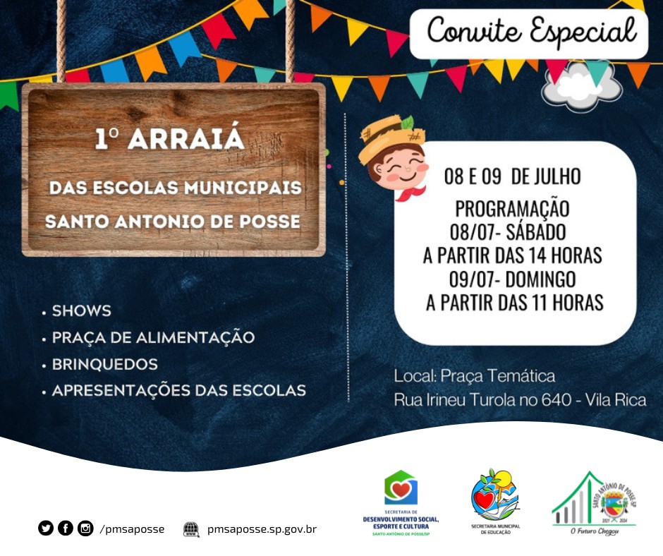 É com imensa alegria que anunciamos o 1º Arraiá das Escolas Municipais de Santo Antônio de Posse! O evento será realizado nos dias 8 e 9 de julho, na Praça Temática (Gastone Mazotti), localizada na Rua Irineu Turola, nº 640, no bairro Vila Rica.
